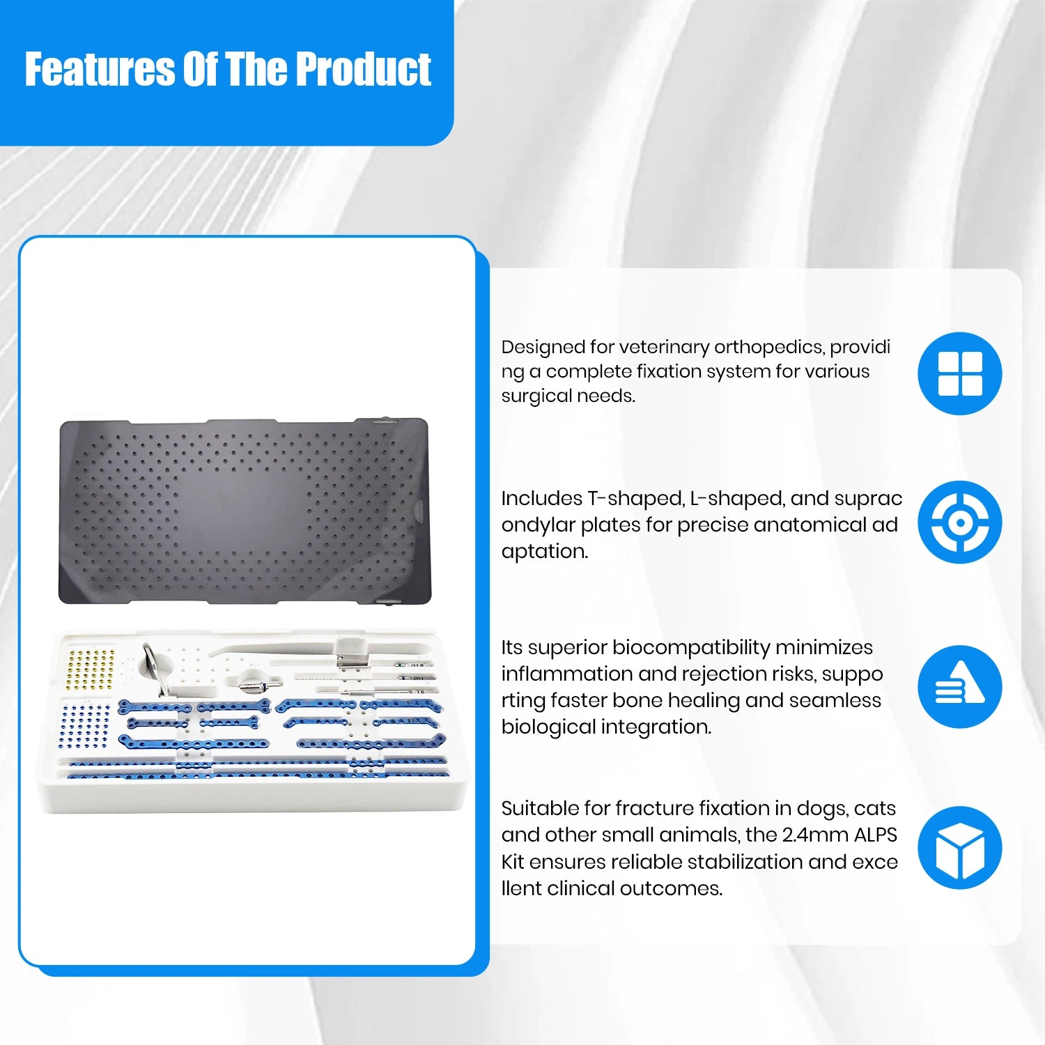 Ideal for distal femoral condyle repairs, proximal tibial plateau fractures, humeral condylar and radius/ulna reconstruction in small to medium patients, the 2.4 mm ALPS set delivers predictable biomechanical stability, streamlined surgical workflow, and enhanced postoperative outcomes for veterinary specialists performing small-animal fracture fixation.