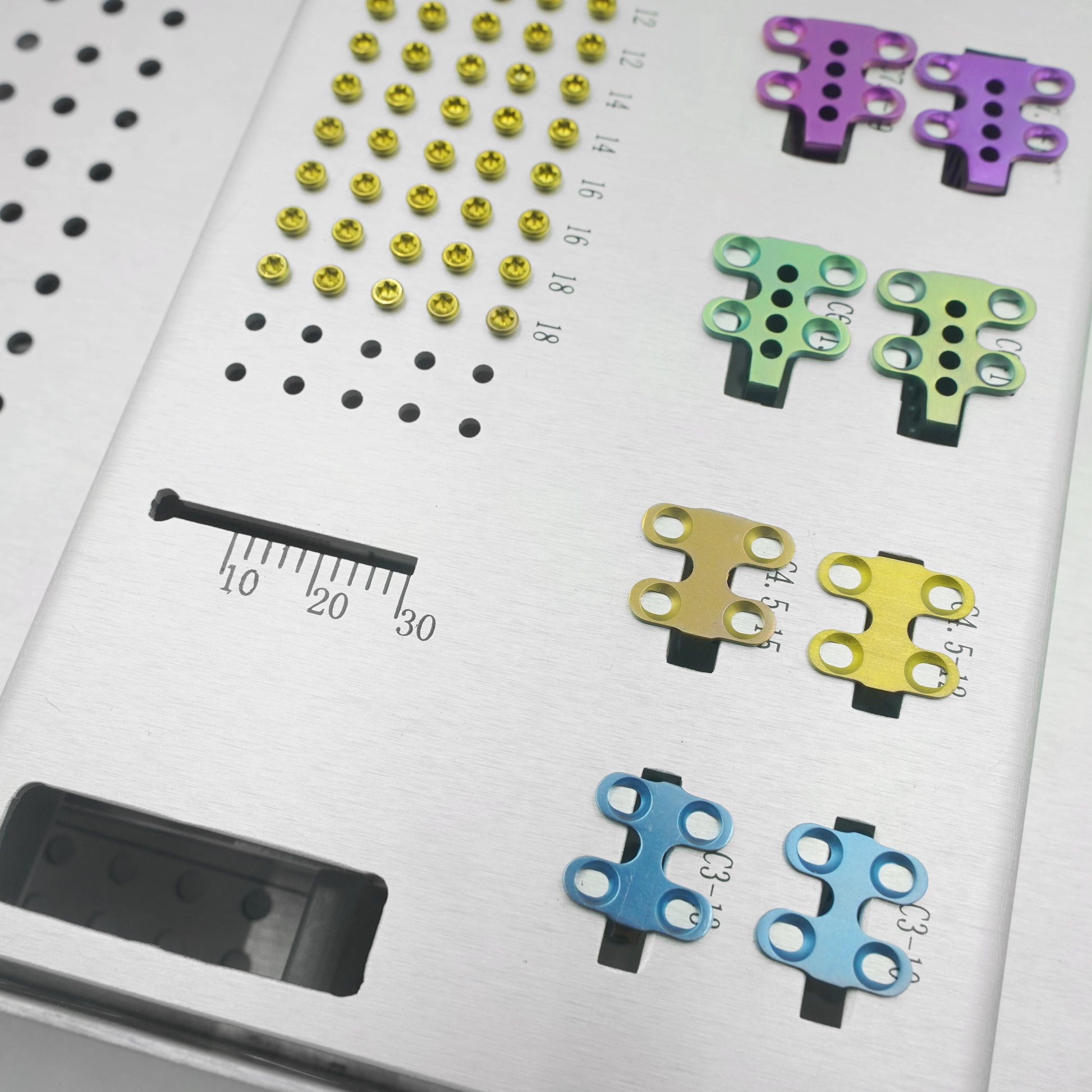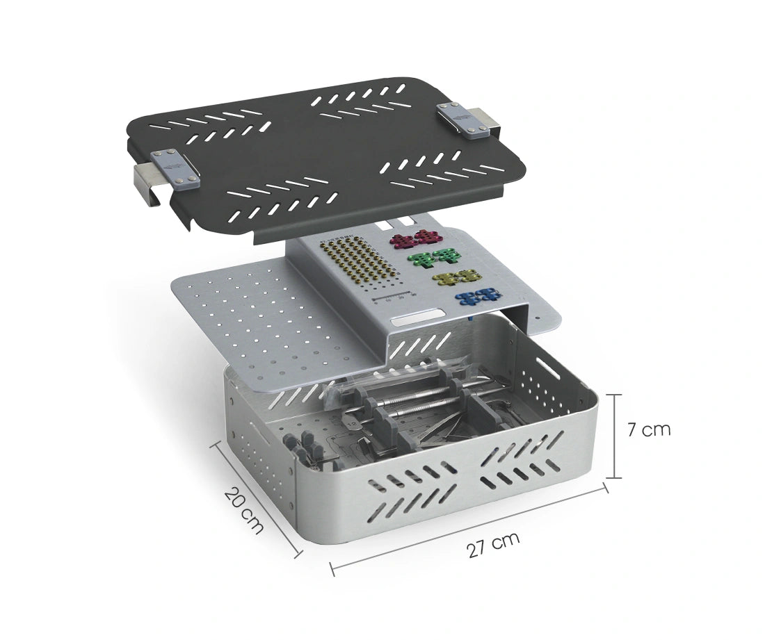 Color-coded screwdrivers and clearly labeled drill guides ensure fast identification and smooth surgical workflow.