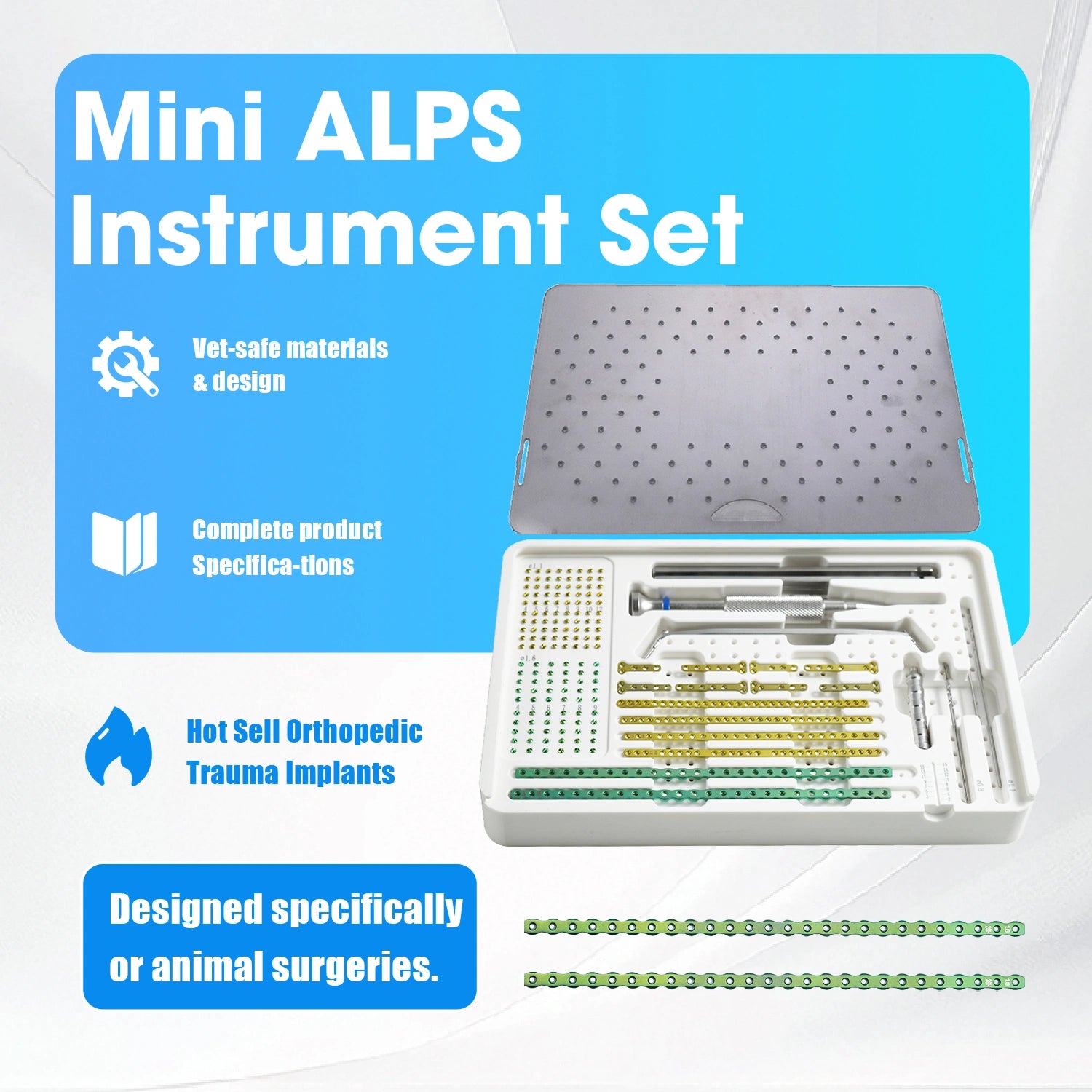 With its anatomically contoured titanium plates, AO-style quick coupling, and optimized screw layout, the Mini ALPS Set is an ideal choice for veterinary orthopedic specialists seeking efficiency, accuracy, and reliable fixation in miniature animal surgeries.
