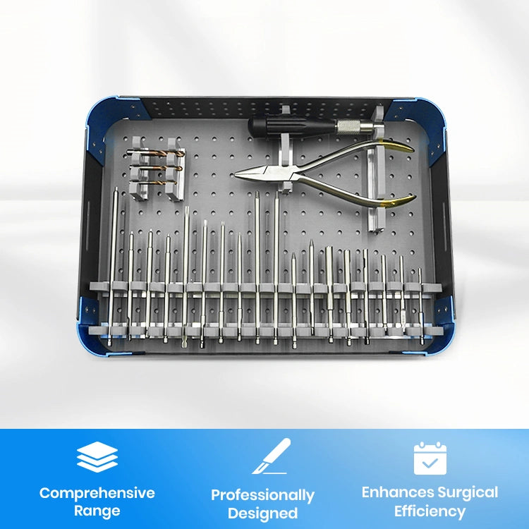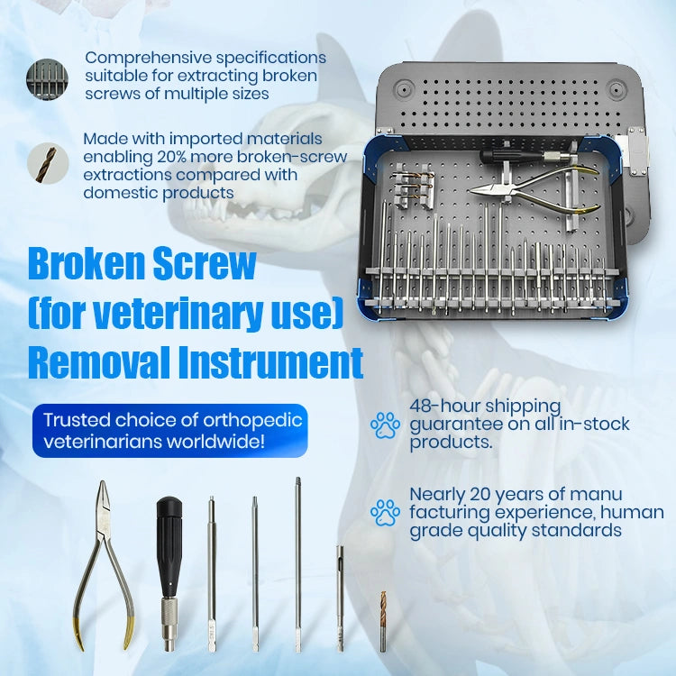 The Veterinary Broken Screw Removal Instrument Set is designed for small animal orthopedic surgeries involving challenging implant removal. It effectively addresses intraoperative issues such as stripped screws, broken screws, and difficult-to-remove implants, helping veterinarians work more efficiently and safely.